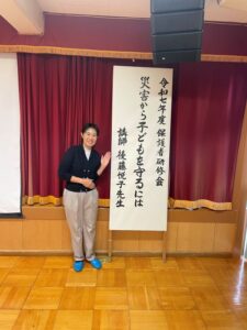 園長先生が、達筆な文字で講座のタイトルと講師名を記した立派な看板を作ってくださいました。